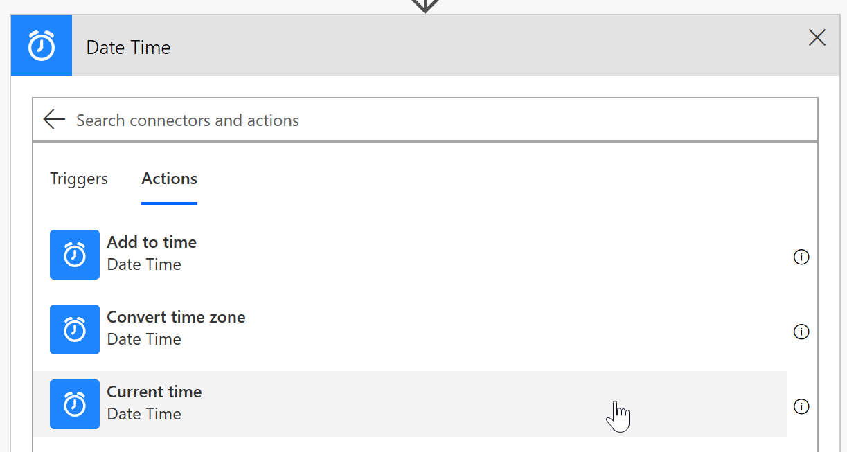 In the example, the work week is starting on Monday at 8.30 AM and end on Friday at 5 PM. To define the date on Friday, “Date Time” – actions will be used to get the current date and time. This will reflect the date on this Friday that the Flow is running.