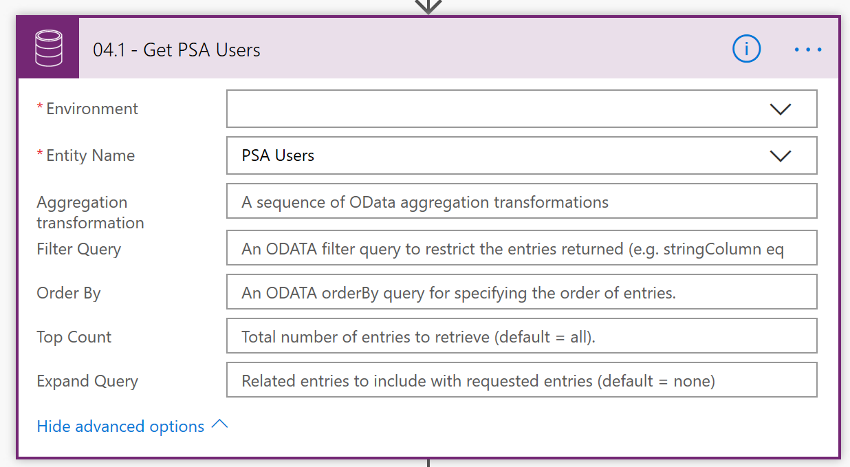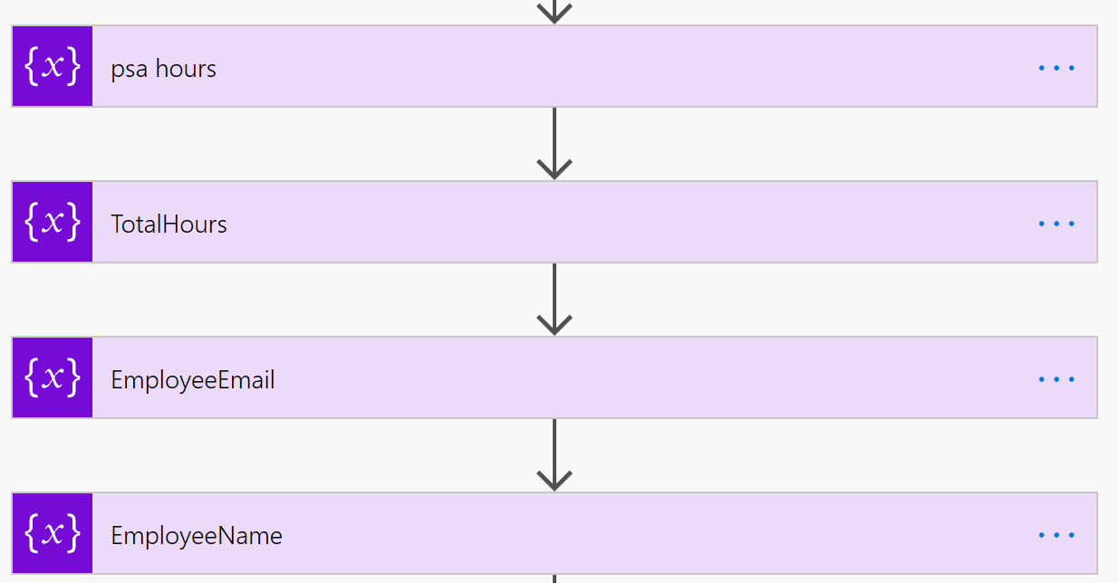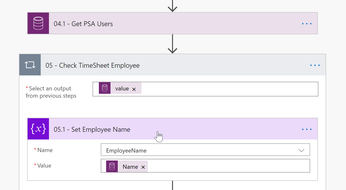 The first step of the process is getting the Employee Name (Because in PSA the employee/user is a unique number). The name of the employee can be found in the Entity “PSA Users”, under the field “psa_name”. This value will be set into the variable “EmployeeName”.