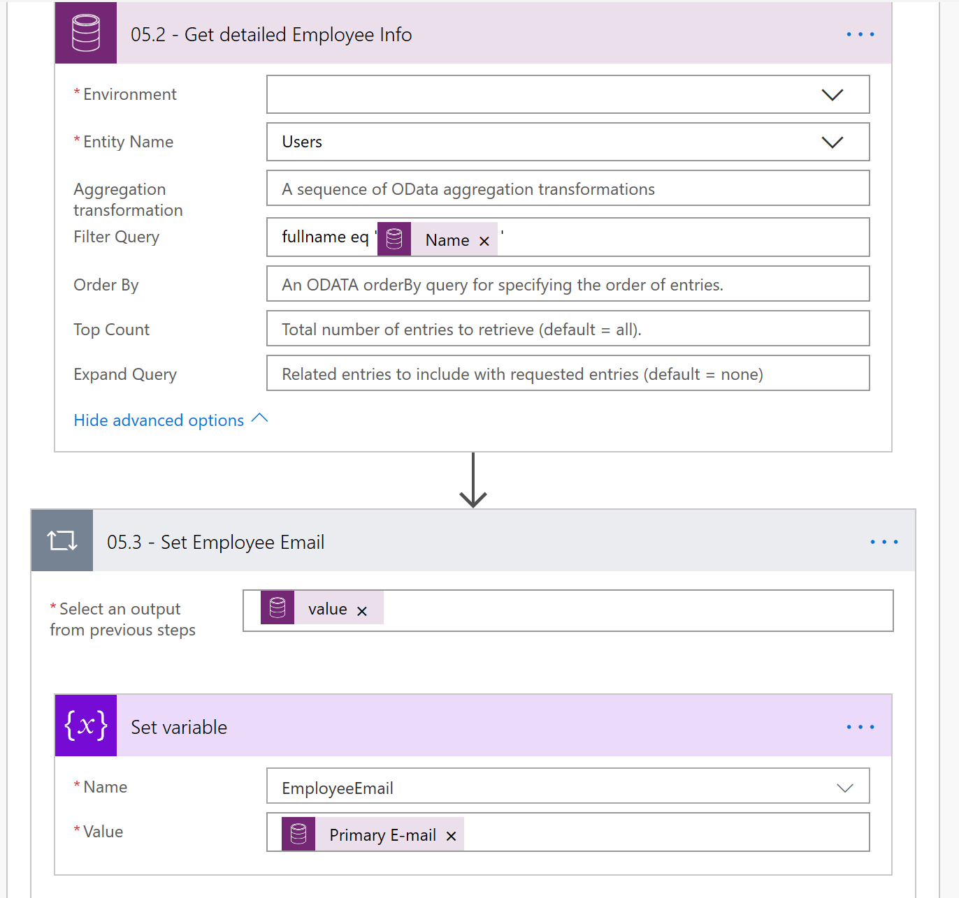 The second and third step will get the employee e-mail address and this can be found in the entity “Users”. This entity contains detailed employee/user information.