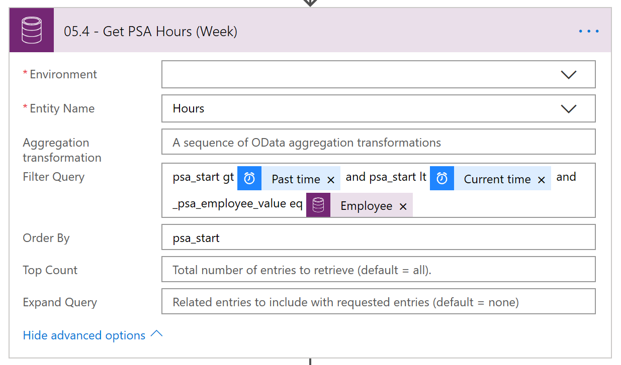 The output value will contain the Primary E-mail address of the employee/user (field “internalemailaddress” in the entity Users), this value will be set to the variable “EmployeeEmail” The fourth step in the process will be filtering the weekly registered hours out the entity “Hours”.