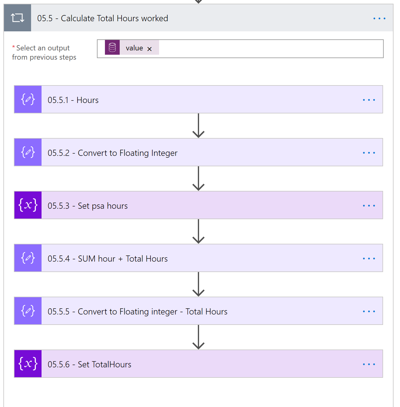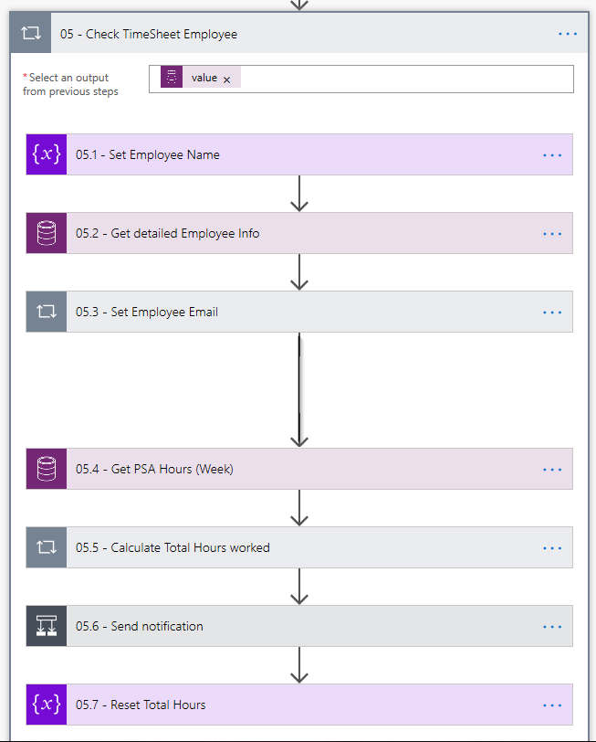 After collecting the first information, check of the timesheet for an employee can be started. Process 05 – Check timesheet employee” will handle the work. Six steps in the “apply to each” – loop will calculate the total hours in registered for an employee and sent a notification when needed. Let’s look deeper into the process.