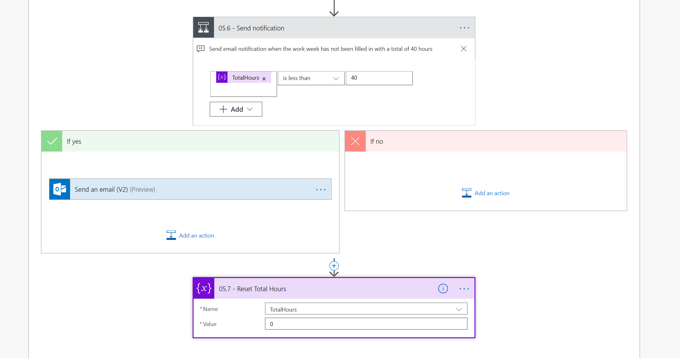 In the last two steps, the total amount of hours will be check if there is a minimum of 40 hours registered, when not email notification will be sent to the employee/user to review his weekly time registration. The total hours variable will be reset to zero for the next check for another employee/user.