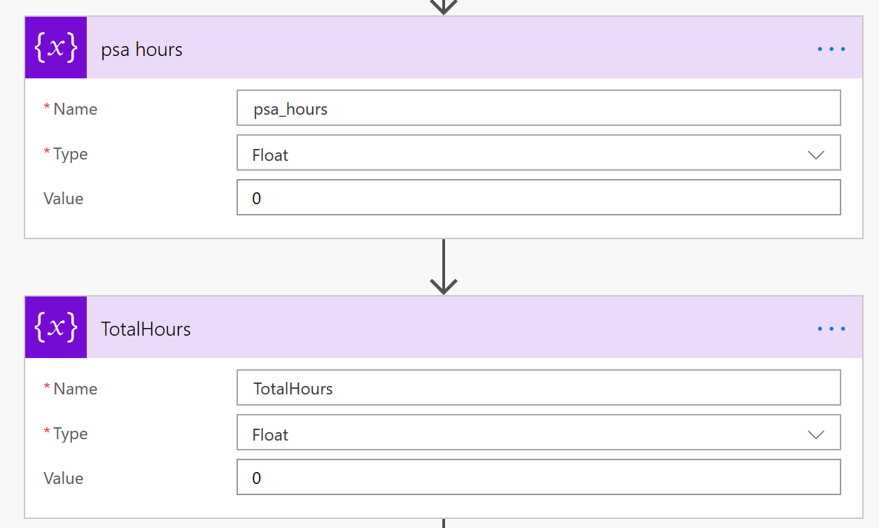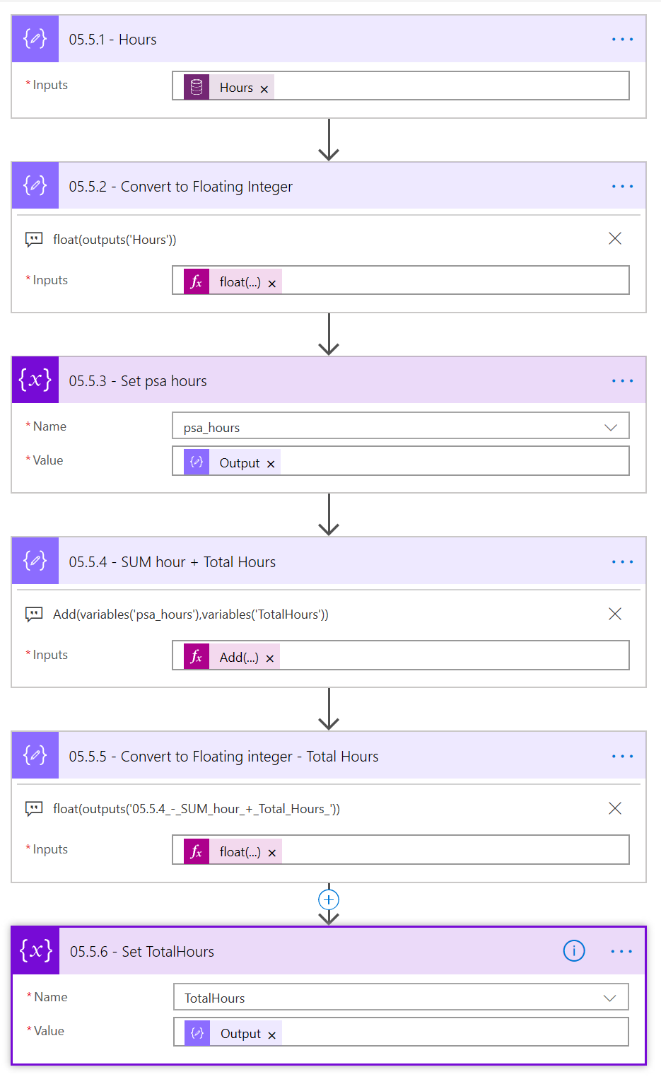 Getting the hours will result in output as a string (example 1.5). This need to be converted to a floated integer value, before adding to the number variable that has been defined upfront, see screenshots below.
