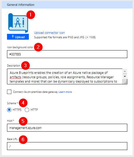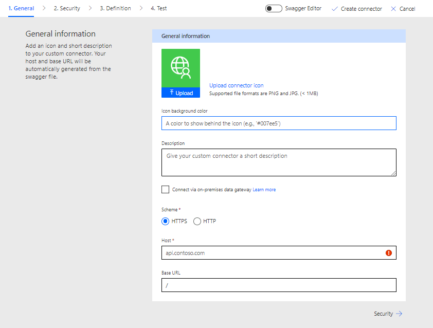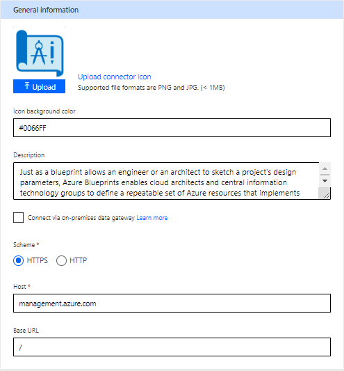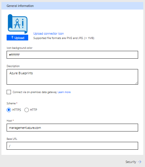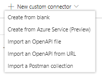 Click “New custom connector” and choose in drop down “Create from blank”.