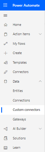 Open Power Automate and select “Data” and click on “Custom connectors”.