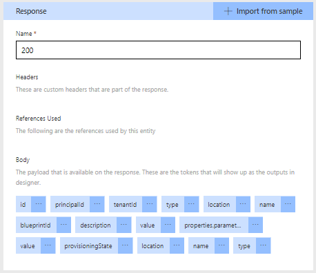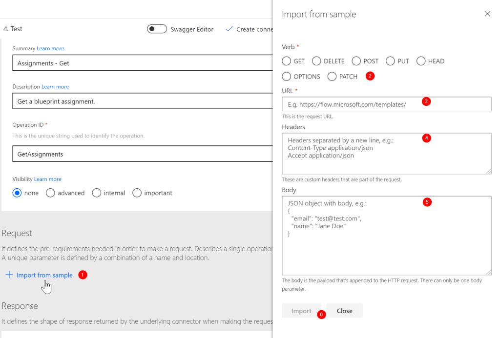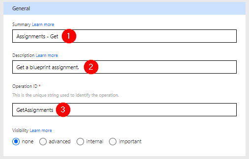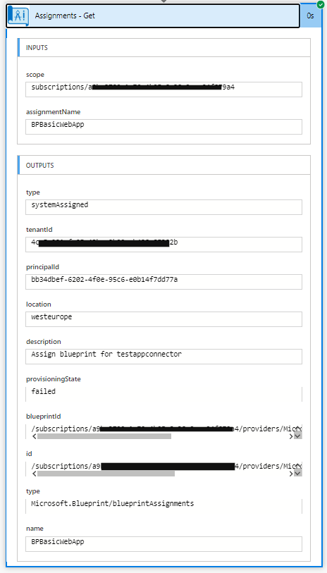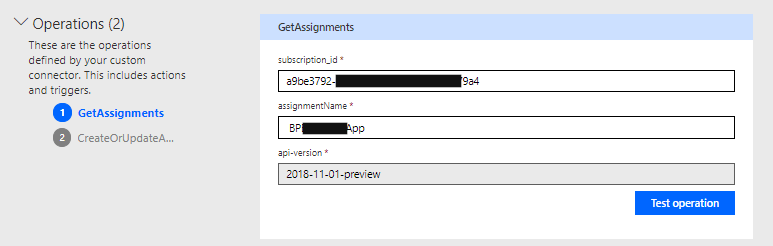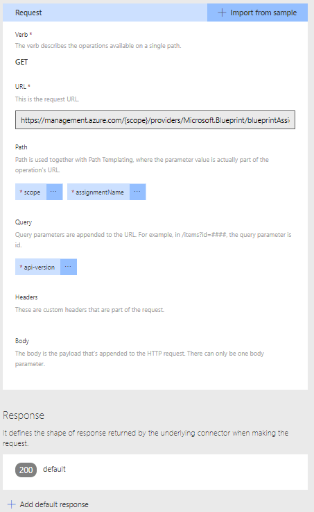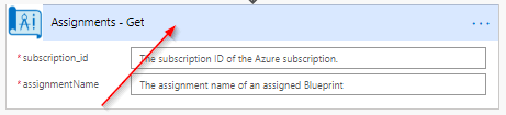 In the last step, we will create actions based in the REST API list. In this example we will add the get assignments in Azure Blueprints.
