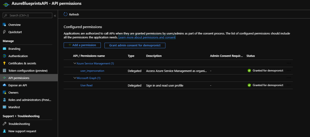 This exist out of two part: Azure and the configuration of the custom connector. In Azure, we will create a new app registration and make note of the application id and secret. Adding the Azure Service Management as API permission and push “Grant Admin consent for <Name>” to activate the permissions