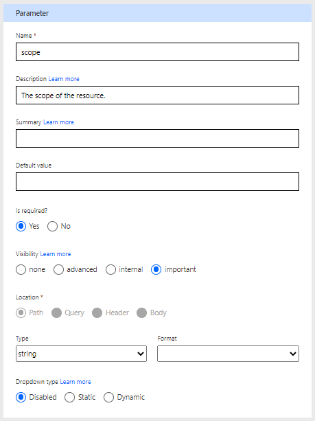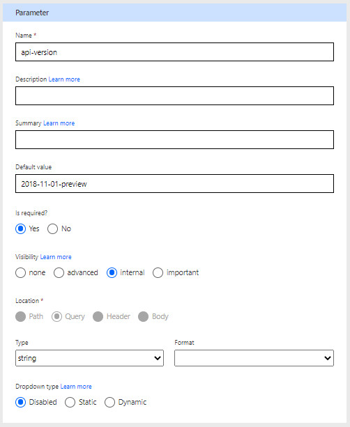 Select is required to “Yes” and visibility to internal. This selection will not been shown in the connector action overview, this setting is directly used internally into the custom connector as a default value for this parameter.