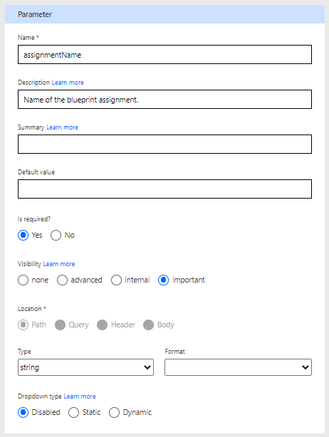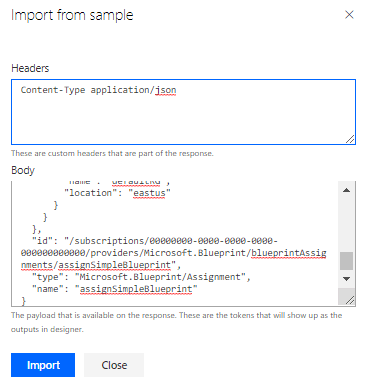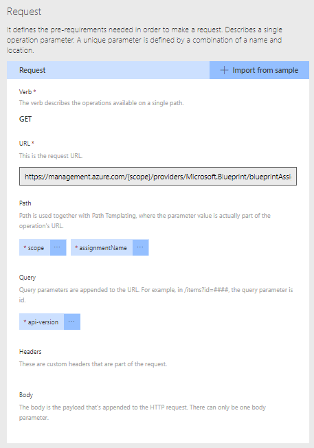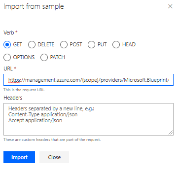 Click “import from template” and complete the fields at your rights side: GET https://management.azure.com/{scope}/providers/Microsoft.Blueprint/blueprintAssignments/{assignmentName}?api-version=2018-11-01-preview