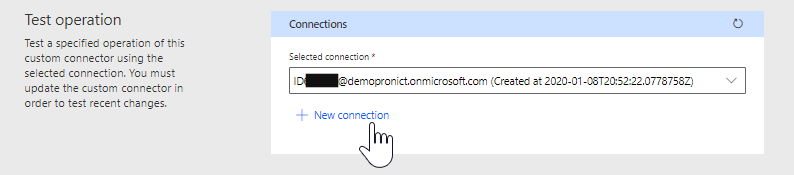 We can test the connector by clicking on test or by adding the connector into a Flow. Create first a new connection to get the token: