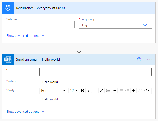 - Creation of a Power Automate Flow, simple flow “Hello World” sending an email with the Office 365 connector at a recurring time using the schedule trigger.