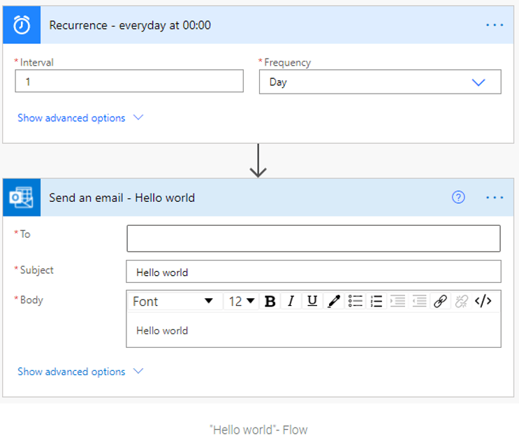 Listed up some test scenarios and created a very simple flow “Hello World”, that is sending an email to a specific person. The schedule that has been included is “every day at midnight”.