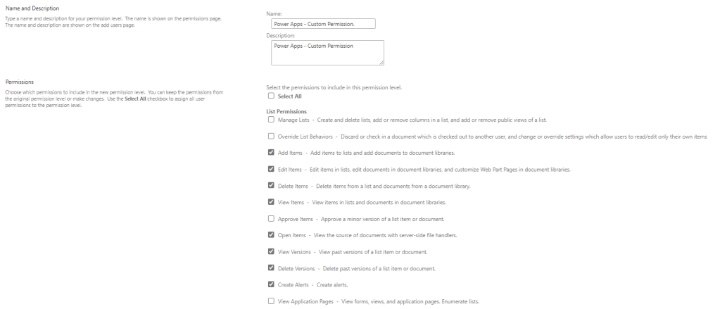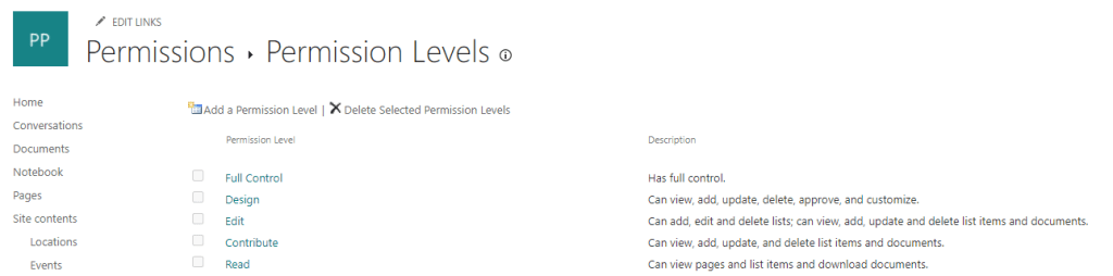 Click “Create” at the end of the page. The new permission level is visible in the list.