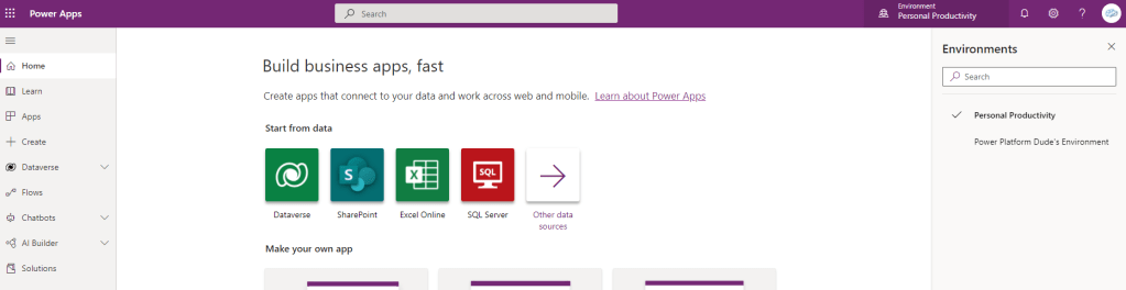 - A development environment to develop and test Power Apps, Power Automate, and Microsoft Dataverse. Using premium and custom connectors and different developer environments. (at the writing of this blog, the different developer environments were not yet available and coming soon)