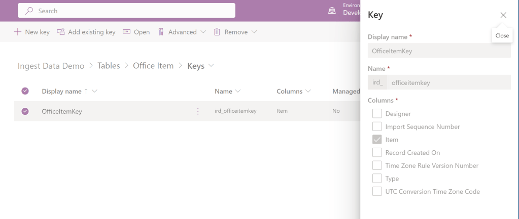An alternate key has been created for the item column. The primary name field is a display field used in Dataverse. This field is used in default views to show the content of the table in other applications. This field isn’t the primary key field and shouldn’t be considered as that. This field can have duplicates because it’s a display field. The best practice, however, is to use a concatenated field to map to the primary name field, so the name is fully explanatory. The alternate key field is what is used as the primary key.