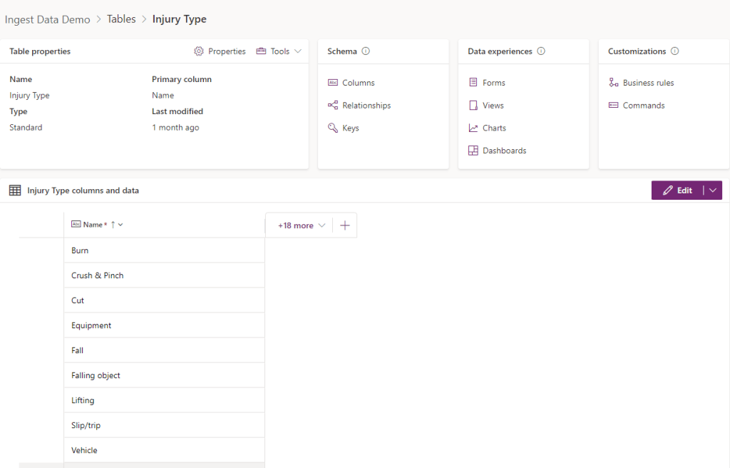 In this example, I will guide you through a data import in Dataverse with data related to a lookup table. The example contains an “injury types” table with prepopulated values. See the screenshot below:
