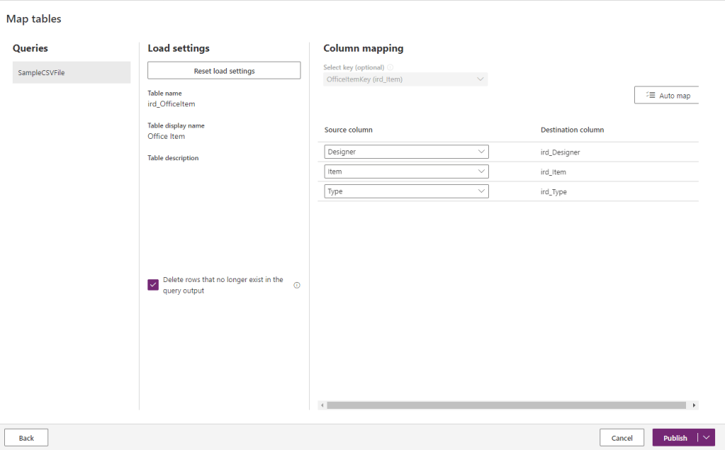 A key column is a column that’s unique and deterministic of a data row in the table. For example, in his, the Item is a critical column in an Office Item table. You shouldn’t have two rows with the same Item. Also, one item with the value “Xerox 1904″—should only represent one row in the table. To choose the key column for the table in Dataverse from the dataflow, you need to set the key field in the tables.