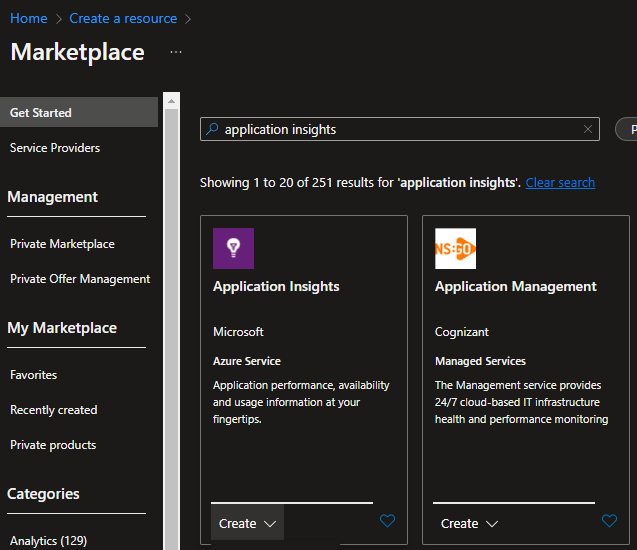 Go to the Azure portal and click on “Create a resource“. Search for “Application Insights” and click on “Create“.