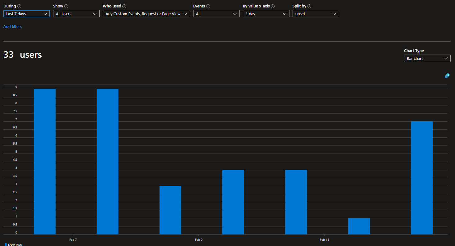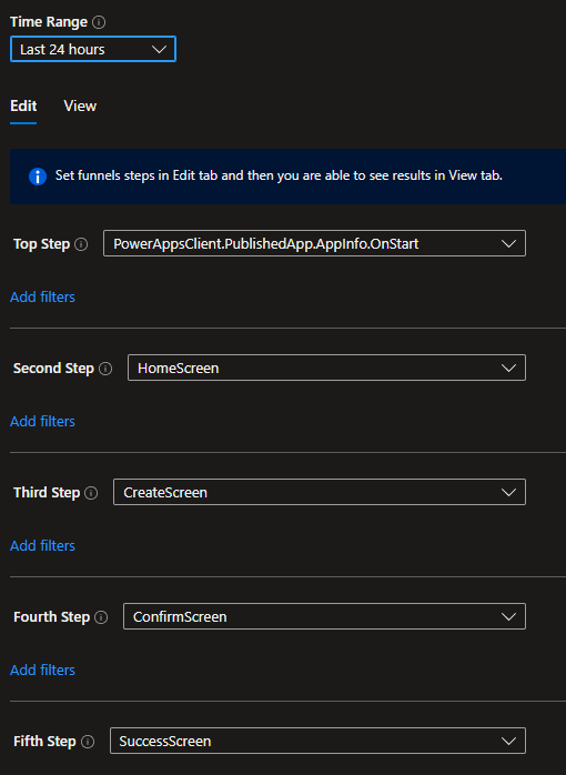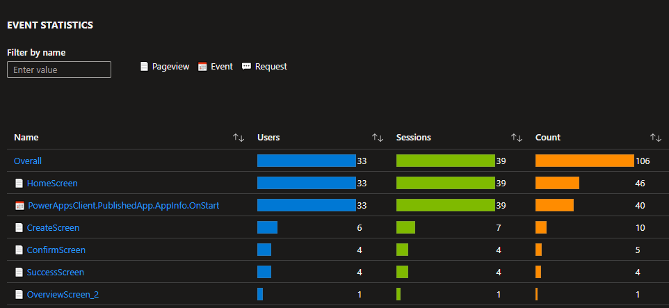 - Custom events and metrics: Define custom events and metrics to track specific aspects of the canvas app’s behaviour, such number of distinct user actions or the performance of particular features.