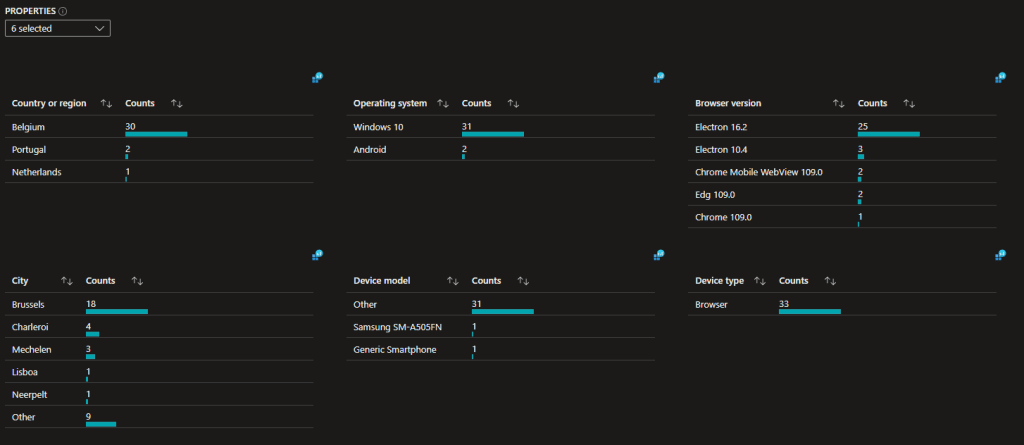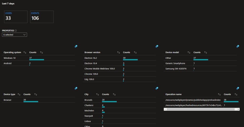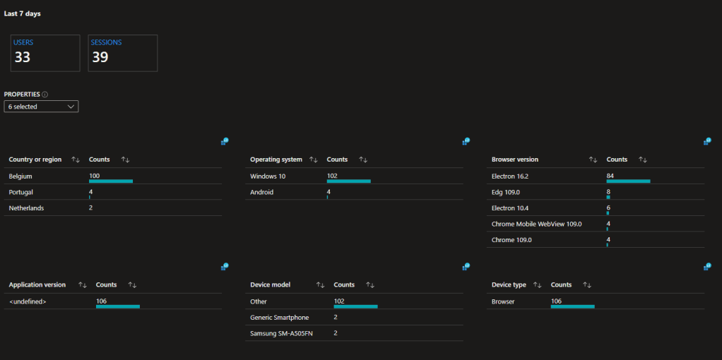 - Sessions: Session information and more insights. Session data will show the numbers of sessions that have started on the canvas app in a specific time frame. The following insights are available: the total number of users and events in the selected time frame, a maximum of six different properties per session, such as country, operating system, browser version, etc.