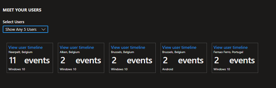 - Users: user access information and more insights. Access data will show the number of end-users connected to the canvas app in a specific time frame. The following insights are available sessions, events, performance, and a maximum of six different properties per-user access session, such as country, operating system, browser version, etc.