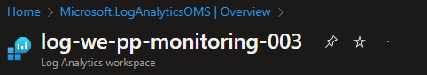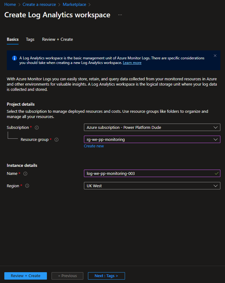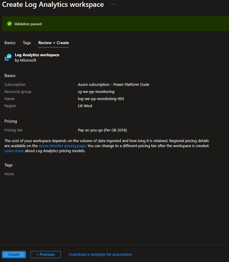 Select subscription, and resource group, give the resource a name and select the Azure region. Select the Azure Log Analytics Workspace that has been created in step 0. Click on “Review + Create“, and then click on “Create” to create the Log Analytics workspace.