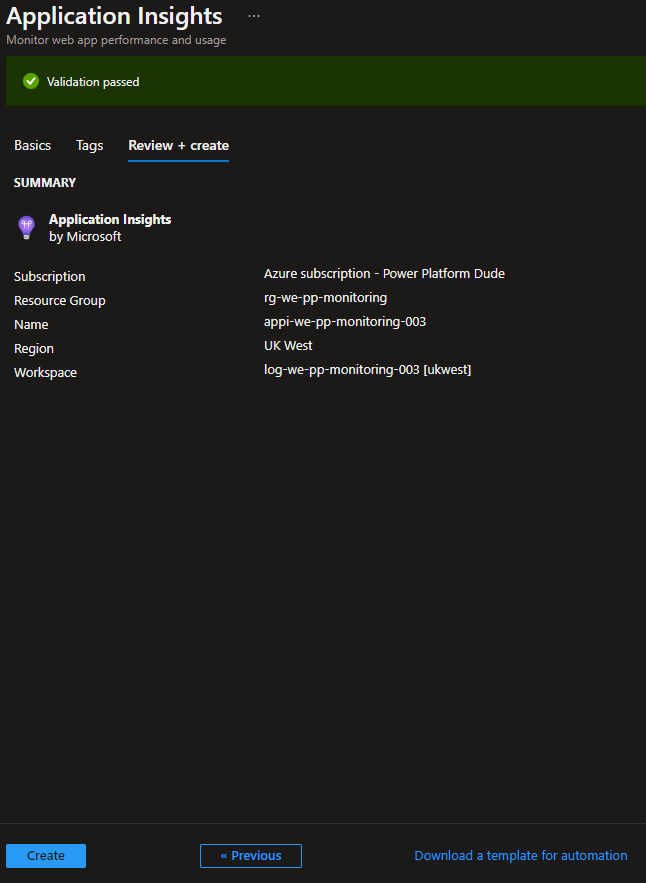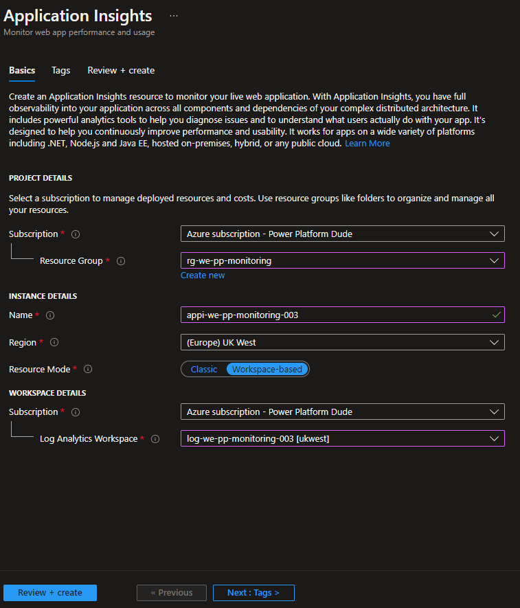 We can use Azure Monitor because it is a complete set of tools that helps to monitor applications, and Azure Application Insights is part of it. In addition to Azure Application Insights, it includes Azure Log Analytics, Dashboards workbooks, and much more. Azure Application Insights lets us quickly detects and fix issues with the Power Platform application to ensure that it is available, efficient, and reliable.