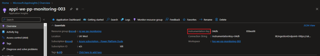 The Azure Application insights resource has been created, and it’s time to connect the Power Platform Canvas app to the resource. We need the instrumentation key of the create Azure Application Insights resource from step 02. The Instrumentation Key is a unique identifier for your Application Insights resource. The key can be found in the overview pane of the application insights resource. See the example below.