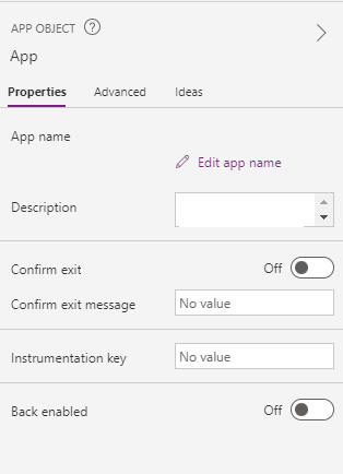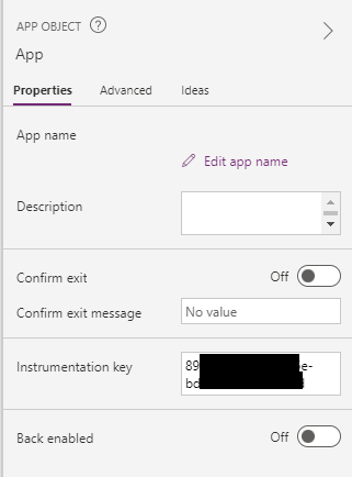 Open the Power Platform Canvas application in Edit modus that will be monitored by the Azure Application insights resource. Copy the instrumentation key and go to the “App” item in the tree view of the Canvas application. In the App Object, the instrumentation key can be pasted in the field “Instrumentation key”