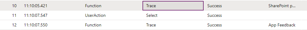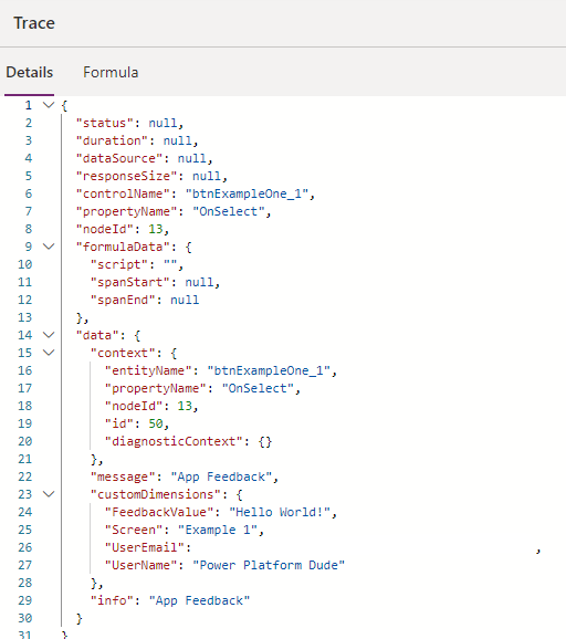 The code will trace an informational message with the logged-in user’s full name, email address, and an example feedback value. Including the screen where the trace has been taken. This is visible in the Power Apps Monitoring tool as follows: