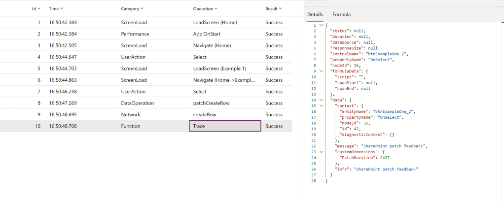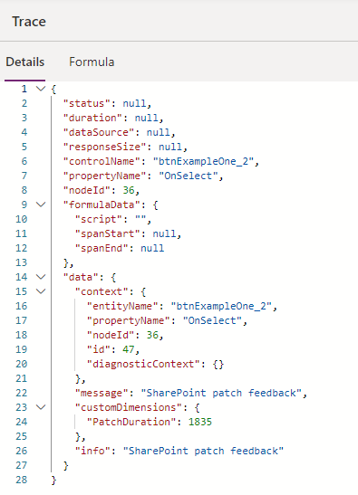 The code will trace an informational message with a patch’s duration value to add a record to a SharePoint list. Trace information visible in Power Apps Monitor