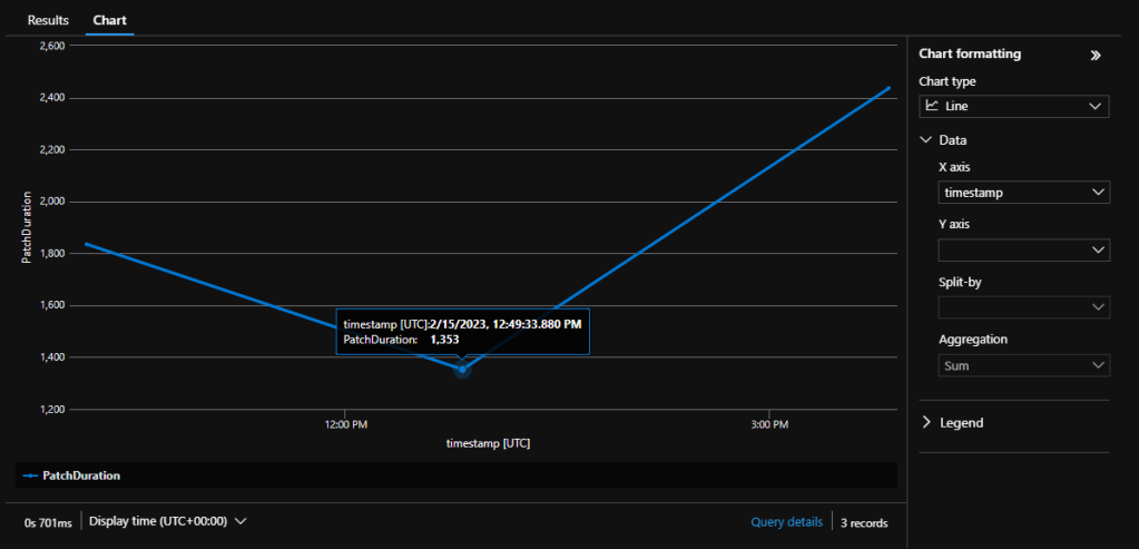 The code above will search for messages with a value equal to “SharePoint patch feedback”. Extending the functionality of the Kusto query to convert the “PatchDuration” value to an integer value. Project the result with the following columns PatchDuration and timestamp. It will allow us to use the values in a line chart to visually represent the output results.